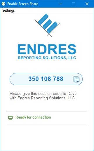 The screen sharing application is now running. A randomly assigned 9-digit code will appear in the application similar to the screenshot below. As the screen states, your computer is now ready for the remote connection. This 9-digit code can now be given to Dave with Endres Reporting Solutions, LLC.