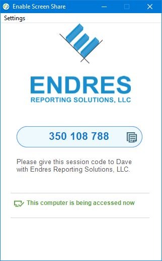 Once the code is given to Dave, the connection will be created. After the connection is made, the following change will be made in the application, showing you your computer is now being accessed. At this point the computer can be controlled and seen by Endres Reporting Solutions, LLC.