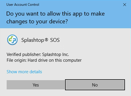 A User Account Control message may appear asking "Do you want to allow this app to make changes to your device?" This message screen will also show Splashtop, Inc. as the verified publisher. Please click "Yes" to the message to begin running the remote screen sharing application.